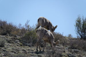We took a look see drive yesterday morning and the critters were definitely out and about. We saw probably 50 -75 Bighorn ewes and one bunch of 7 or 8 rams. And surprisingly we saw a herd of elk on the move. I got a few shots but as they were that far out, they are just too blurry. And we wanted to check on the coyote den but did not see any movement around it. We went a little bit farther when the Boss spotted a bush with ears and it was a coyote. We stopped to glass it and another one that was close by got up and started moving. They both headed back to the den area and disappeared. Looks like we should see some pups soon.